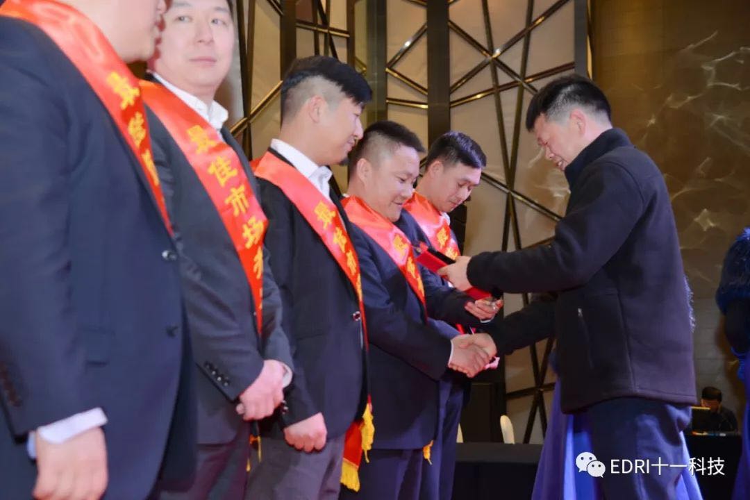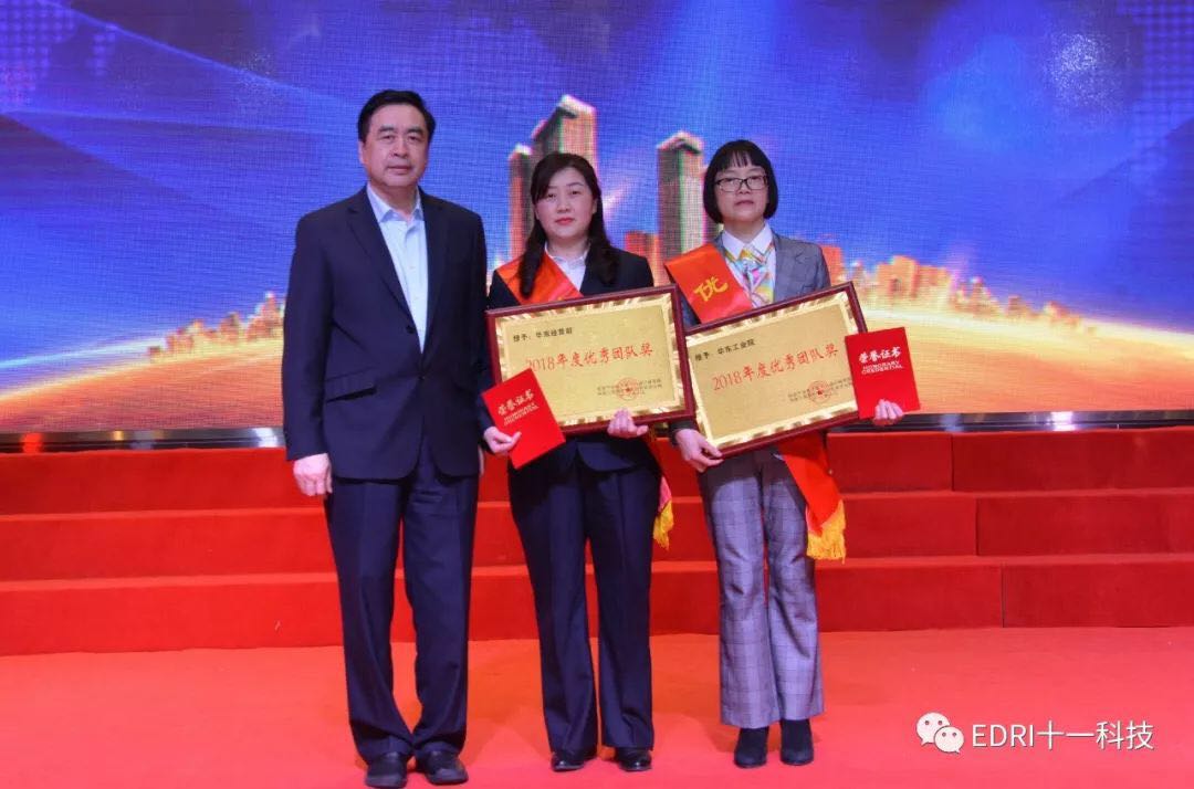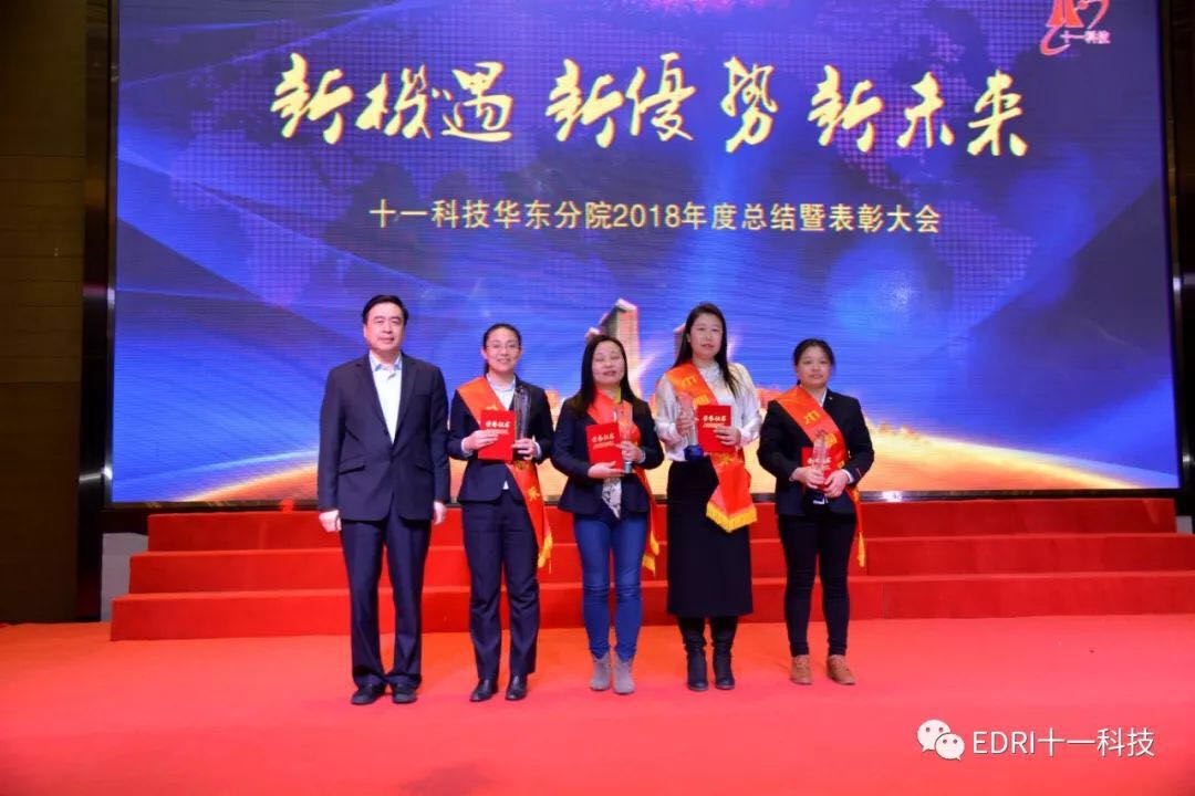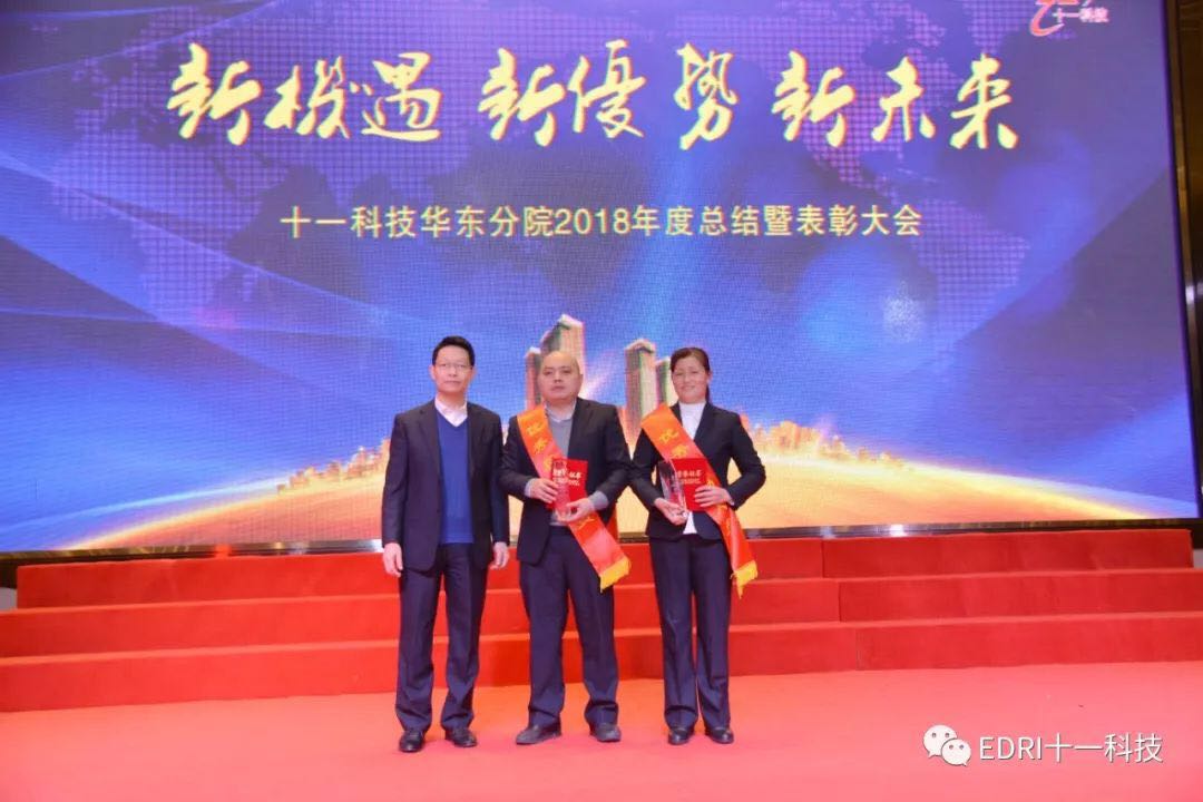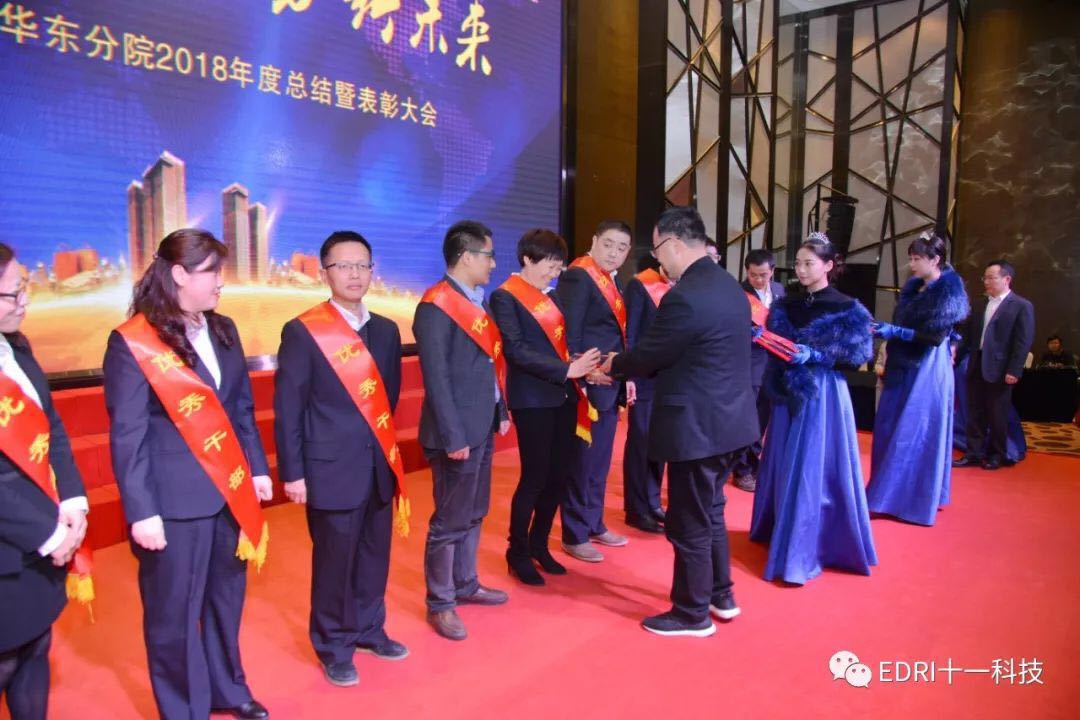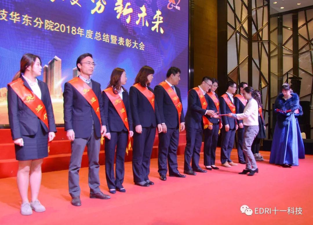 表彰环节,由华东分院执行院长张平主持,十一科技高级专务、华东分院党总支书记刘胜春首先宣读了华东分院2018年度表彰文件,全体参会人员集体观看了表彰视频,短短9分钟视频,高度概括了受表彰人员的先进事迹。会上共表彰了2018年度优秀团队2个、2018年度最佳项目组2个、2018年度优秀干部10名、2018年度巾帼风采5名、2018年度最佳市场开发人员5名、2018年度最佳新人奖6名、2018年度优秀后勤人员2名、2018年度先进个人36名。在热烈的气氛中,68名受表彰人员身披红绶带,分批走上舞台,接过院领导颁发的奖杯和证书。